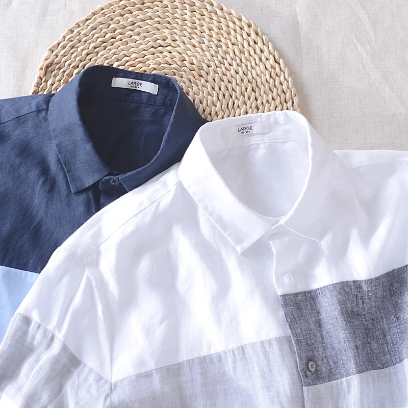 Men’s 100% Linen Patchwork Casual Shirt – Trendy Square Collar Long Sleeve Flax Shirt, Fashionable Travel Wear